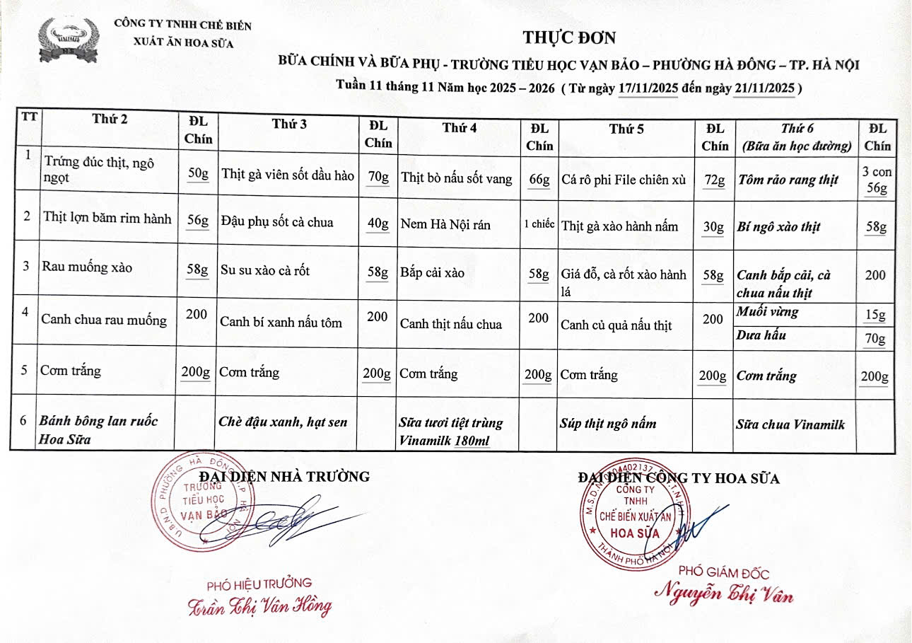 Thực đơn tuần 11 thực hiện từ ngày 16/11/2025 đến21/11/2025