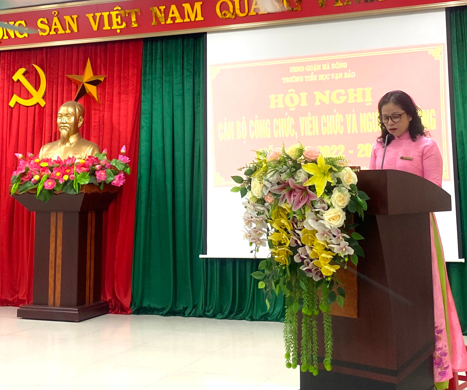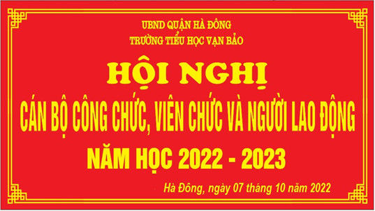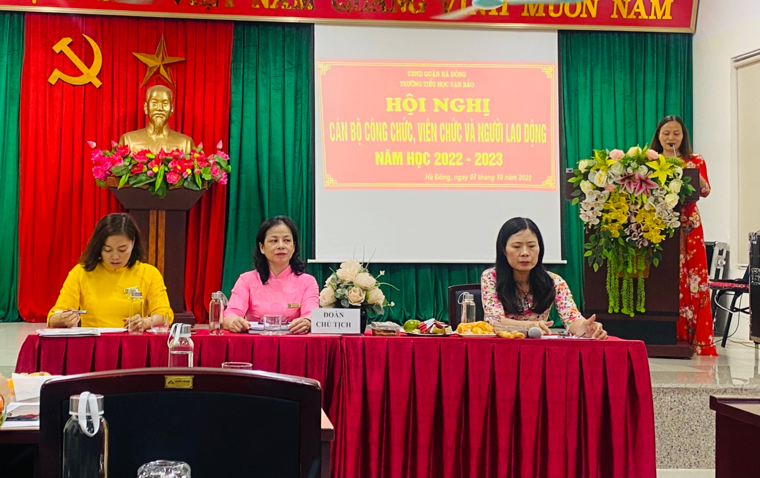 Thực hiện công văn số 89/HD-UBND-LĐLĐ ngày 02/12/2021 của UBND Quận Hà Đông - Liên đoàn Lao động Quận về việc tổ chức Hội nghị CBCC, VC, người Lao động năm học 2022 - 2023. Ngày 07/10/2022, trường Tiểu học Vạn Bảo long trọng tổ chức Hội nghị Cán bộ công chức, viên chức, người lao động năm học 2022-2023.Tham dự hội nghị có đông đủ các đồng chí là cán bộ, giáo viên, nhân viên trường Tiểu học Vạn Bảo. Hội nghị đã được nghe đồng chí Trần Thị Hương - Bí thư chi bộ - Hiệu trưởng nhà trường báo cáo kết quả thực hiện nhiệm vụ năm học 2021-2022 và phương hướng nhiệm vụ năm học 2022-2023. Đồng chí Nguyễn Thị Hương - Phó hiệu trưởng - Chủ tịch Công đoàn nhà trường báo cáo tổng kết phong trào thi đua năm 2021-2022 và dự kiến nội dung phong trào thi đua năm 2022-2023. Đồng chí Đỗ Thị Thu Hằng báo cáo hoạt động Ban thanh tra nhân dân năm học 2021-2022 và chương trình hoạt động năm học 2022-2023. Hội nghị đã bầu ra Ban thanh tra nhân dân nhiệm kỳ 2022-2024 gồm 3 đồng chí: Đỗ Thị Thu Hằng, Đào Thị Thanh Hồng, Trương Thị Thu Hoàn. Hội nghị cán bộ công chức, viên chức năm học 2022-2023 của trường Tiểu học Vạn Bảo thành công tốt đẹp. Trong năm học 2022-2023 tập thể cán bộ, giáo viên, nhân viên trường Tiểu học Vạn Bảo luôn đoàn kết, quyết tâm để gặt hái được nhiều thành công, góp phần vào sự phát triển chung của ngành Giáo dục đào tạo quận Hà Đông. Dưới đây là một số hình ảnh diễn ra trong hội nghị.