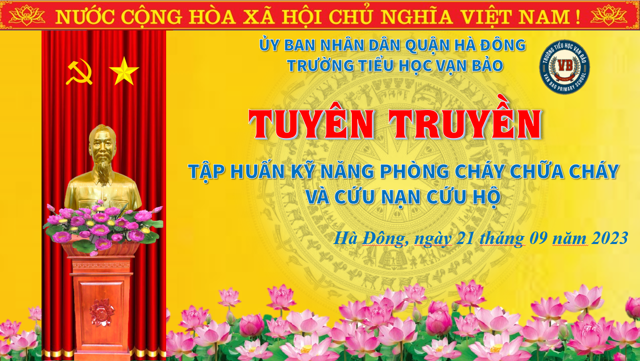Sáng nay, 21/9/2023 Trường tiểu học Vạn Bảo tổ chức ủng hộ các nạn nhân trong vụ hỏa hoạn tại chung cư mini Phường Khương Đình, Quận Thanh Xuân, Hà Nội. Cùng với đó nhà trường kết hợp với Công an quận Hà Đông tổ chức buổi Tuyên truyền Tập huấn kĩ năng Phòng cháy chữa cháy và Cứu nạn cứu hộ. Qua buổi tuyên truyền đã giúp cho Thầy - trò trường tiểu học Vạn Bảo hiểu biết về sự nguy hiểm của hoả hoạn và trau dồi thêm kiến thức PCCC và CNCH trong và ngoài nhà trường. Một số hình ảnh trong buổi tuyên truyền, ủng hộ.