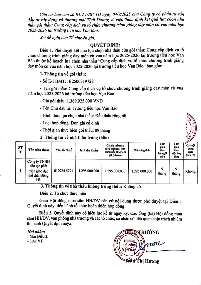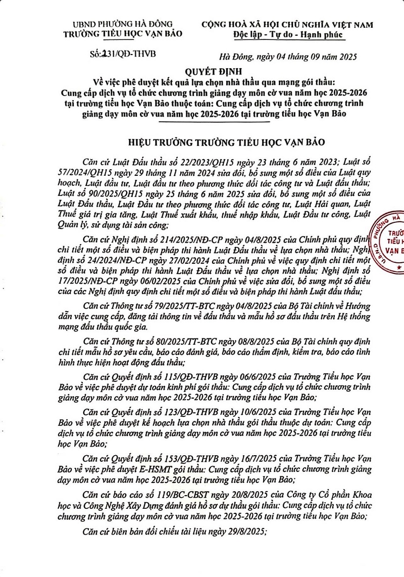 Quyết định về việc phê duyệt kết quả lựa chọn nhà thầu qua mạng gói thầu: Cung cấp dịch vụ tổ chức chương trình giảng dạy môn cờ vua năm học 2025-2026 tại trường tiểu học Vạn Bảo thuộc toán: Cung cấp dịch vụ tổ chức chương trình giảng dạy môn cờ vua năm học 2025-2026 tại trường tiểu học Vạn Bảo