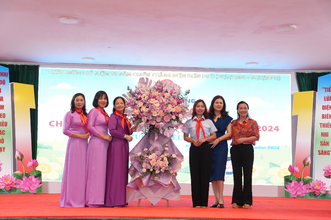 Đại diện lãnh đạo Hội đồng Đội Quận Hà Đông và cán bộ Phòng giáo dục và đào tạo Quận Hà Đông tặng hoa chúc mừng nhà trường tổ chức Liên hoan