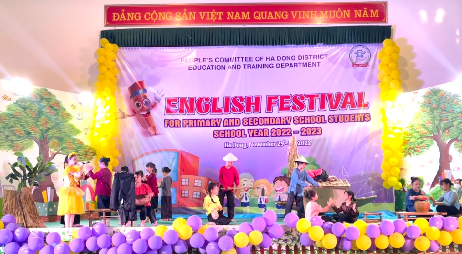 Thực hiện Kế hoạch của Phòng Giáo dục và Đào tạo quận Hà Đông về tổ chức Ngày hội Tiếng Anh dành cho học sinh cấp Tiểu học năm học 2022 - 2023. Nhằm tạo môi trường cho học sinh tự tin, mạnh dạn trong việc sử dụng Tiếng Anh và giao tiếp với người bản ngữ, tạo sân chơi bổ ích cho học sinh thông qua việc tham gia đóng kịch, hát múa .....