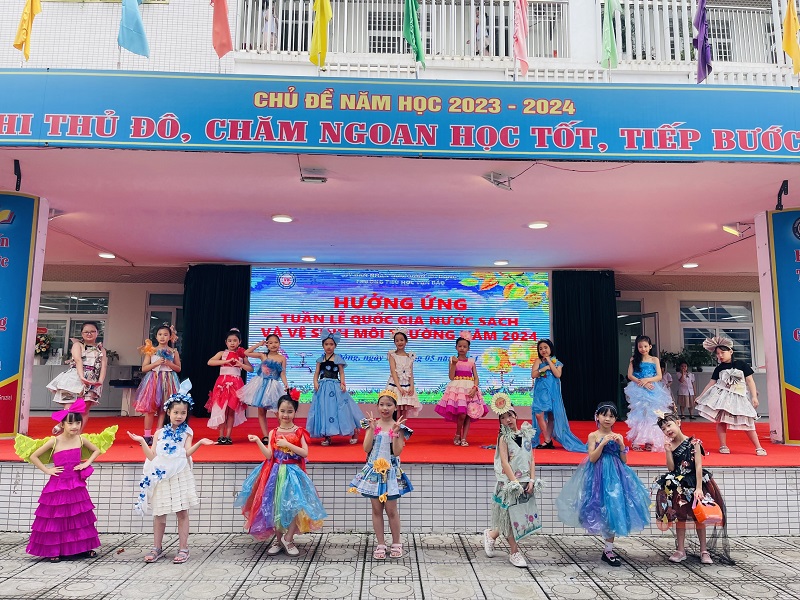 Màn biểu diễn thời trang từ những vật liệu tái chế với chủ đề "Chúng em bảo vệ môi trường".
